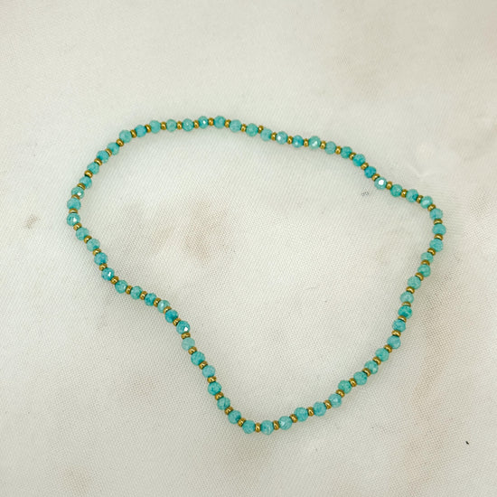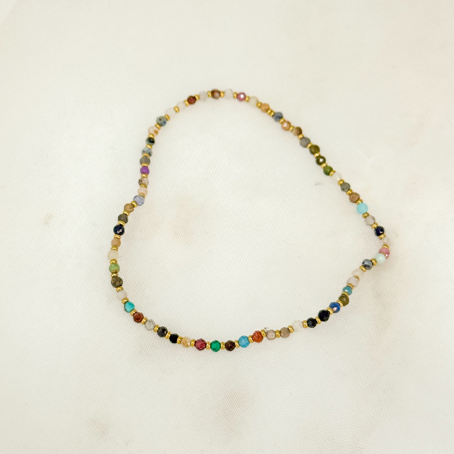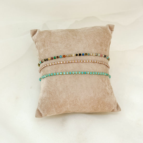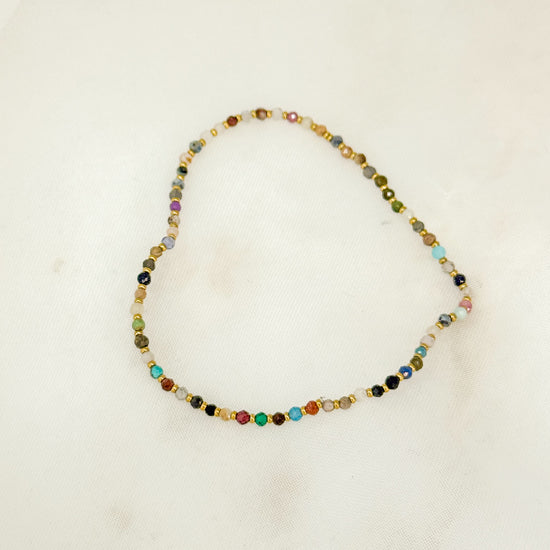 Scopri il fascino del layering con questi eleganti bracciali elastici realizzati con cristalli sfaccettati multicolore e pepite in ottone bagnato oro giallo.