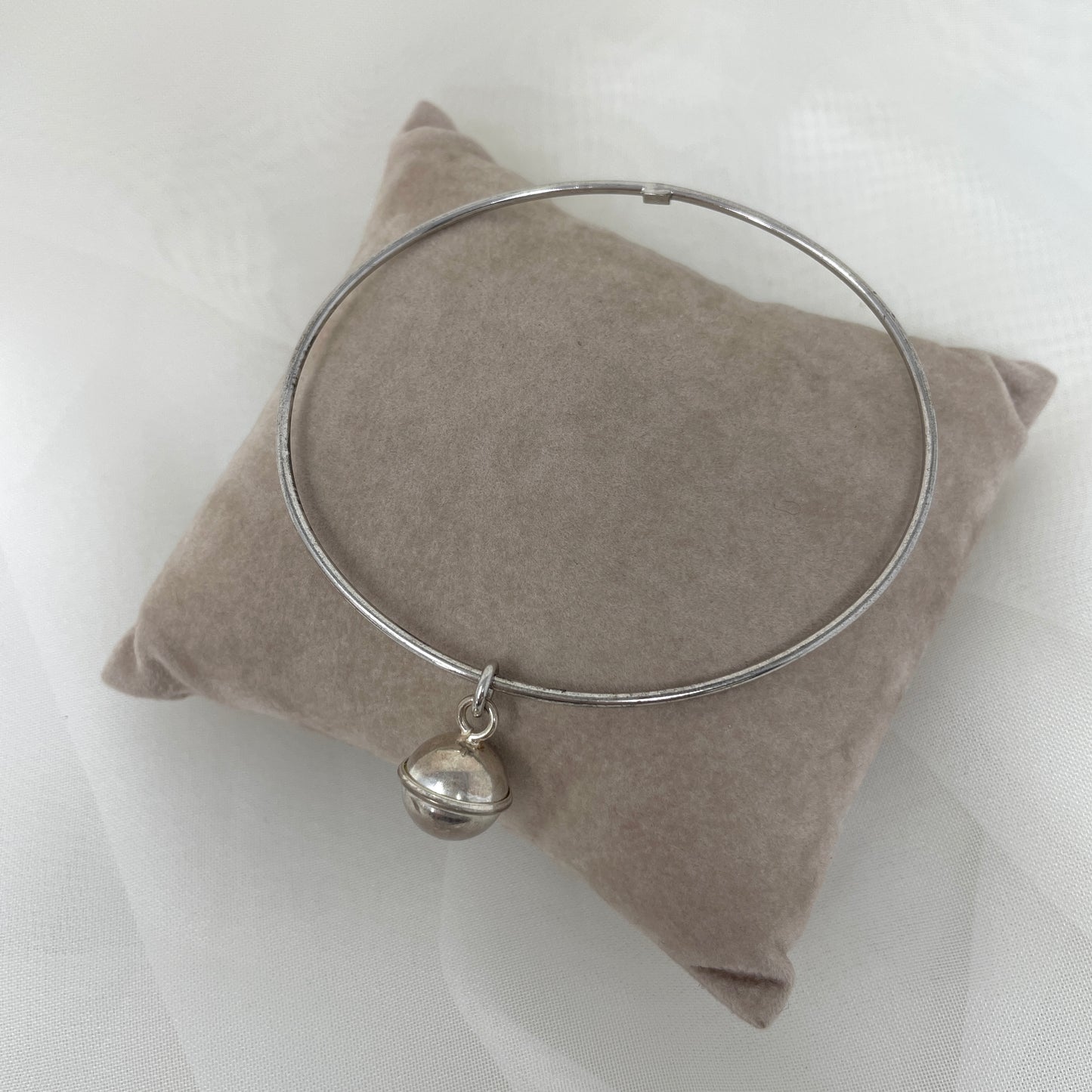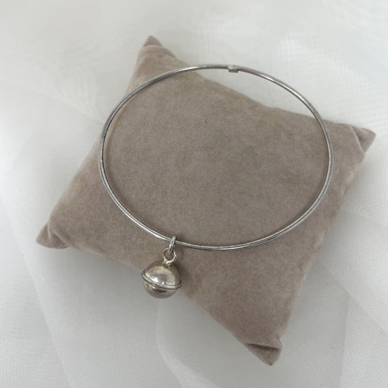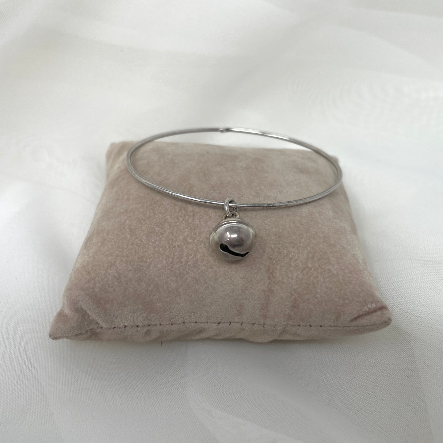 Bracciale rigido con campanellino da 1 cm in argento bianco. Diametro bracciale 7 cm.